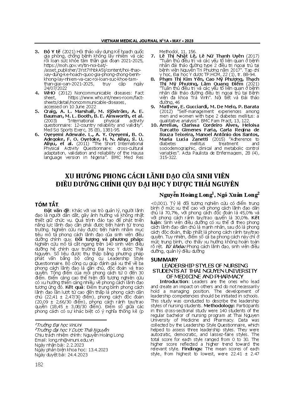 Xu hướng phong cách lãnh đạo của sinh viên điều dưỡng chính quy Đại học Y dược Thái Nguyên = Leadership styles of nursing students at Thai Nguyen university of medicine and pharmacy