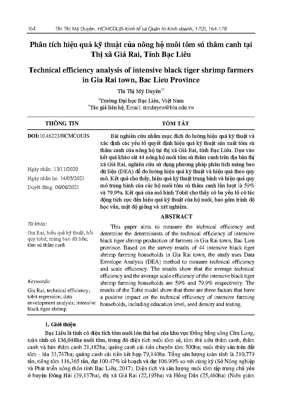 Phân tích hiệu quả kỹ thuật của nông hộ nuôi tôm sú thâm canh tại Thị xã Giá Rai, Tỉnh Bạc Liêu = Technical efficiency analysis of intensive black tiger shrimp farmers in Gia Rai town, Bac Lieu Province