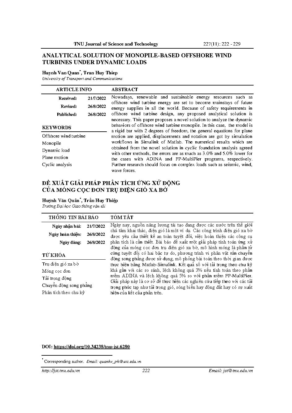 Đề xuất giải pháp phân tích ứng xử động của móng cọc đơn trụ điện gió xa bờ = Analytical solution of monopile-based offshore wind turbines under dynamic loads