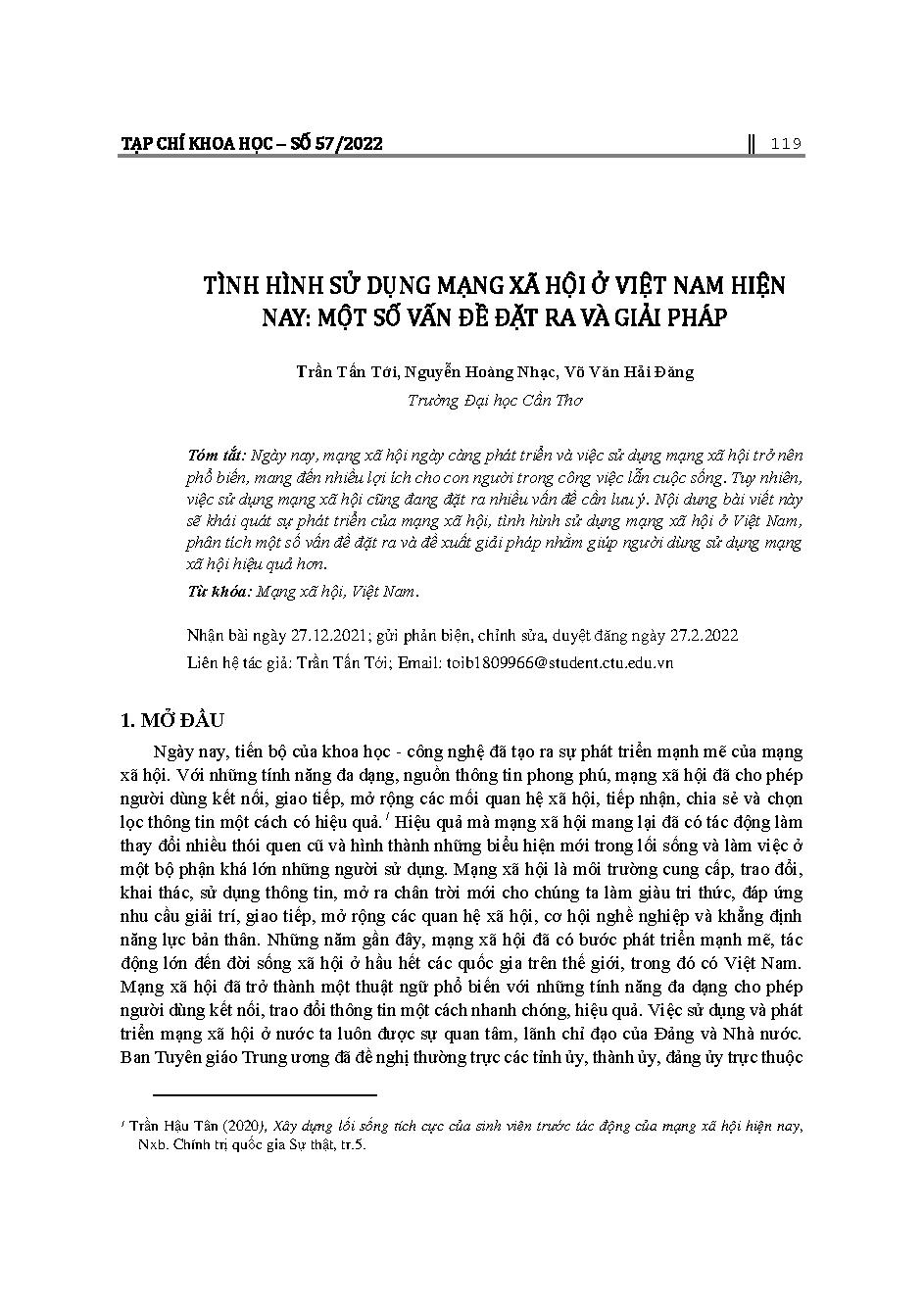 Tình hình sử dụng mạng xã hội ở Việt Nam hiện nay: một số vấn đề đặt ra và giải pháp = The current situation of using social network in Vietnam: some problems and solutions