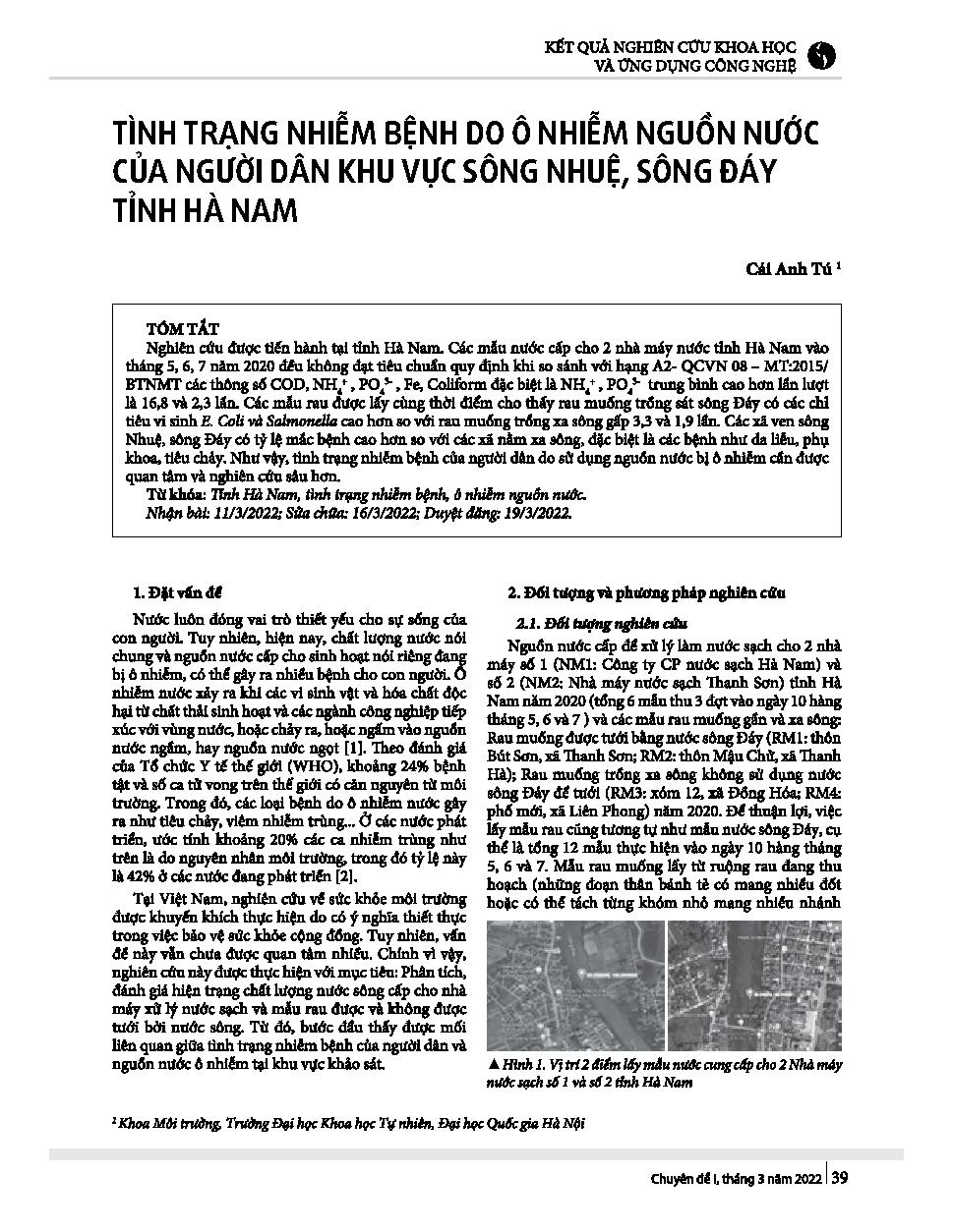 Tình trạng nhiễm bệnh do ô nhiễm nguồn nước của người dân khu vực sông Nhuệ, sông Đáy tỉnh Hà Nam = Infection status due to water pollution of people in Nhue and Day river areas, Ha Nam province