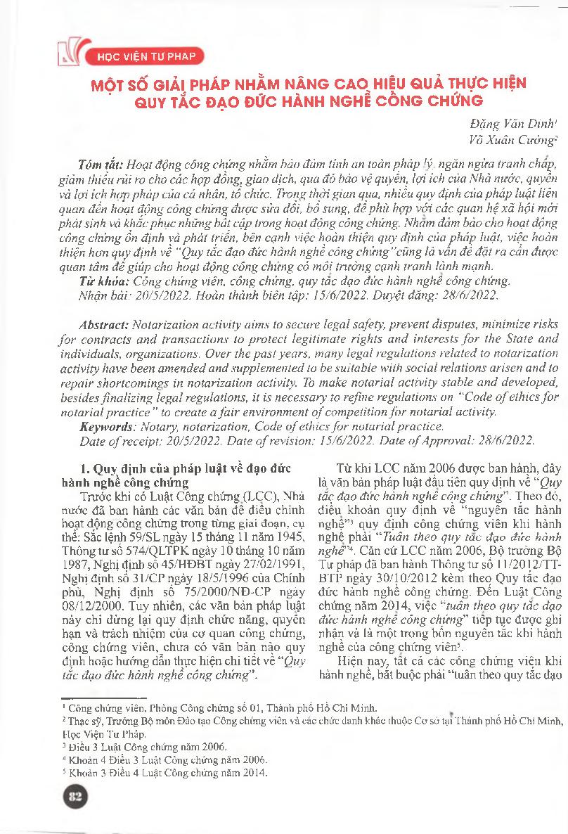 Một số giải pháp nhằm nâng cao hiệu quả thực hiện quy tắc đạo đức hành nghề công chứng = Some solutions to enhance effiency of carrying out code of ethics for notaries