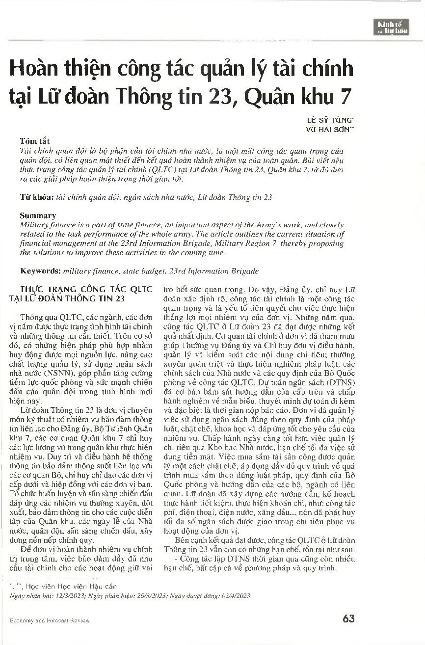Hoàn thiện công tác quản lý tài chính tại Lữ đoàn Thông tin 23, Quân khu 7