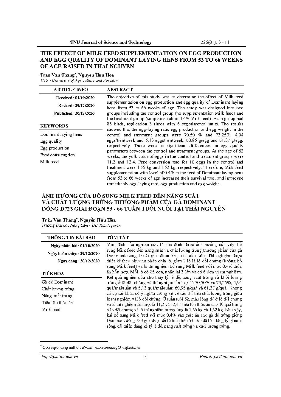 Ảnh hưởng của bổ sung milk feed đến năng suất và chất lượng trứng thương phẩm của gà dominant dòng d723 giai đoạn 53 - 66 tuần tuổi nuôi tại Thái Nguyên = The effect of milk feed supplementation on egg production and egg quality of dominant laying hens from 53 to 66 weeks of age raised in thai nguyen