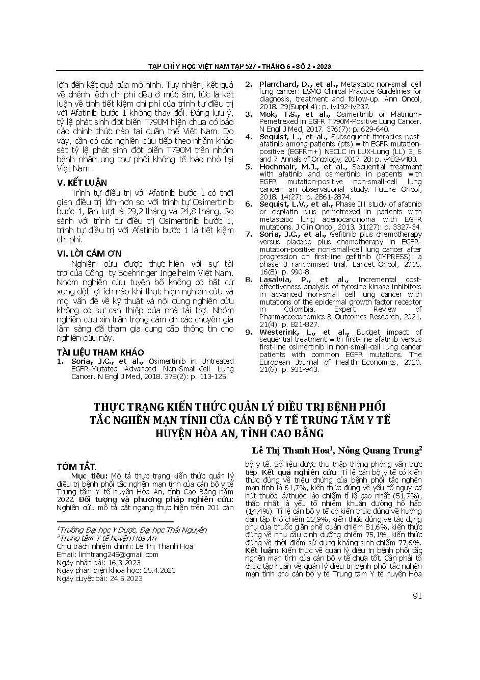 Thực trạng kiến thức quản lý điều trị bệnh phổi tắc nghẽn mạn tính của cán bộ y tế Trung tâm Y tế huyện Hòa An, tỉnh Cao Bằng = The current status of knowledge on management and treatment of chronic obstructive pulmonary disease among medical staff at Hoa