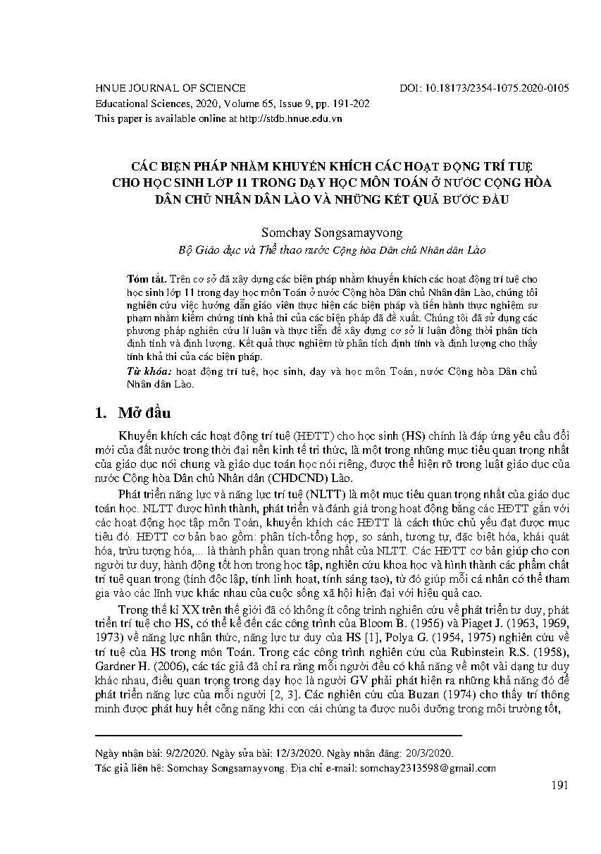 Các biện pháp nhằm khuyến khích các hoạt động trí tuệ cho học sinh lớp 11 trong dạy học môn toán ở nước Cộng hòa Dân chủ Nhân dân Lào và những kết quả bước đầu = Ways to encourage intellectual activitesfor grade 11 students in teaching Mathematics at high school in Lao People’s Democratic Republic