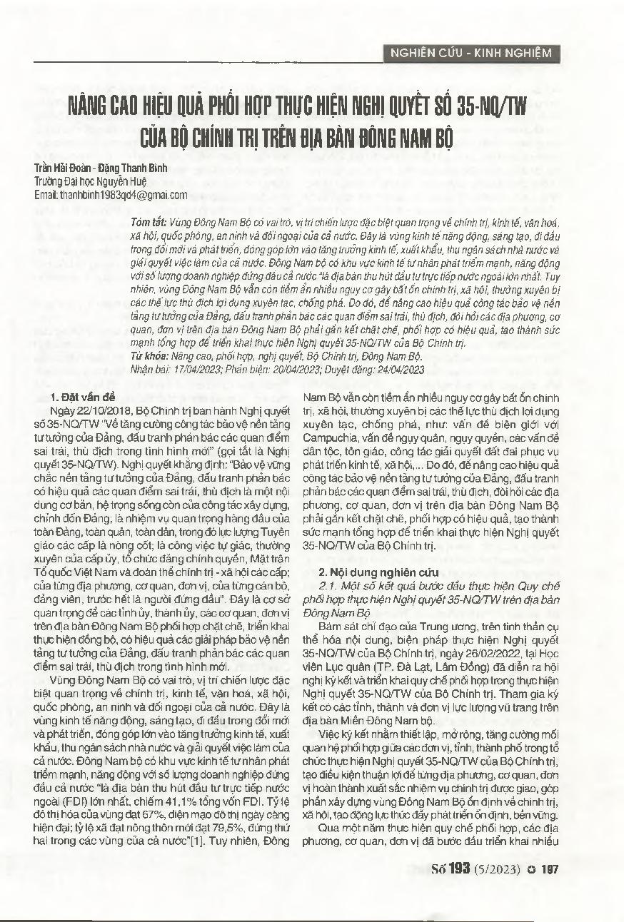 Nâng cao hiệu quả phối hợp thực hiện Nghị quyết số 35-NQ/TW của Bộ chính trị trên địa bàn Đông Nam Bộ = Improve the efficiency of coordination in implementing Resolution No. 35-NQ/TW of the Politburo in the Southeast region.