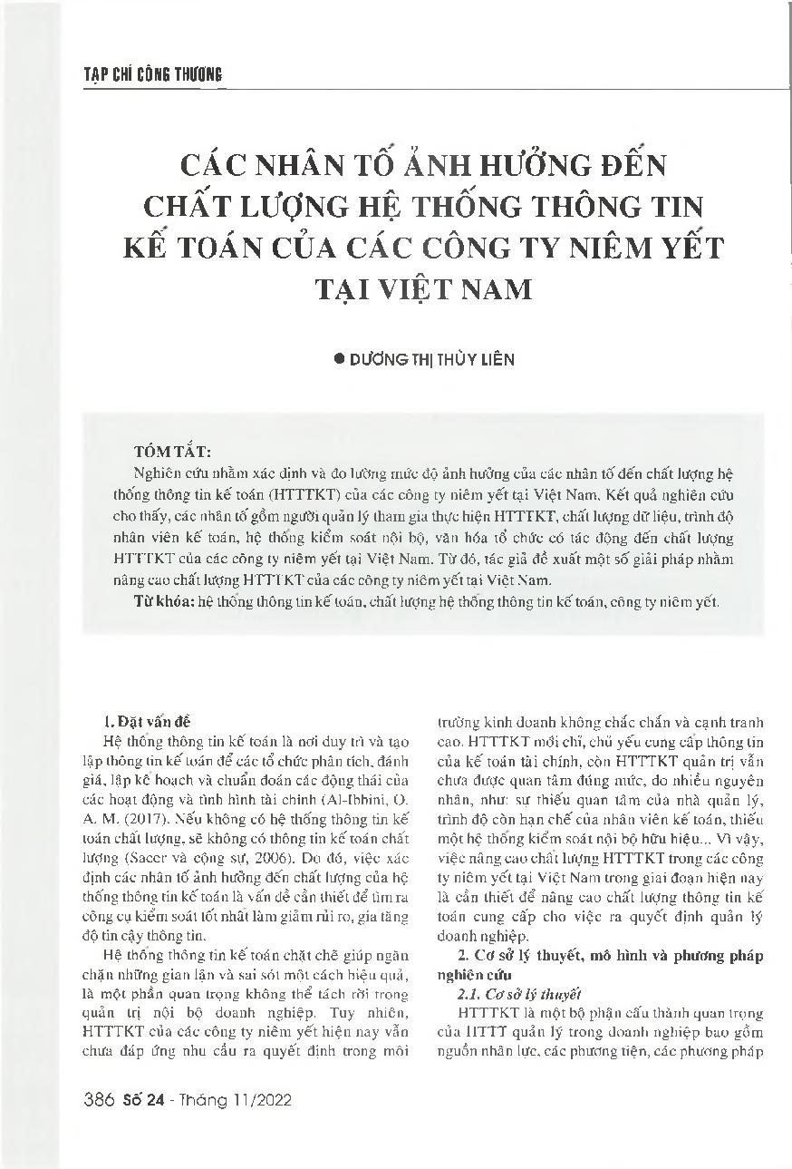 Các nhân tố ảnh hưởng đến chất lượng hệ thống thông tin kế toán của các công ty niêm yết tại Việt Nam = Factors affecting the quality of accounting information systems of listed companies in Vietnam