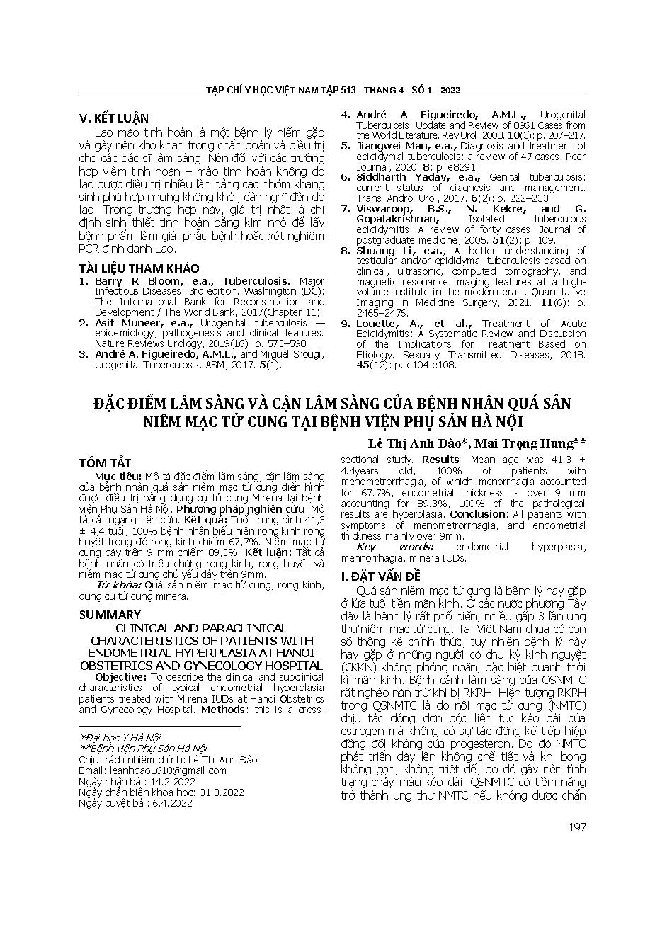 Đặc điểm lâm sàng và cận lâm sàng của bệnh nhân quá sản niêm mạc tử cung tại Bệnh viện Phụ sản Hà Nội = Clinical and paraclinical characteristics of patients with endometrial hyperplasia at Hanoi obstetrics and gynecology hospital