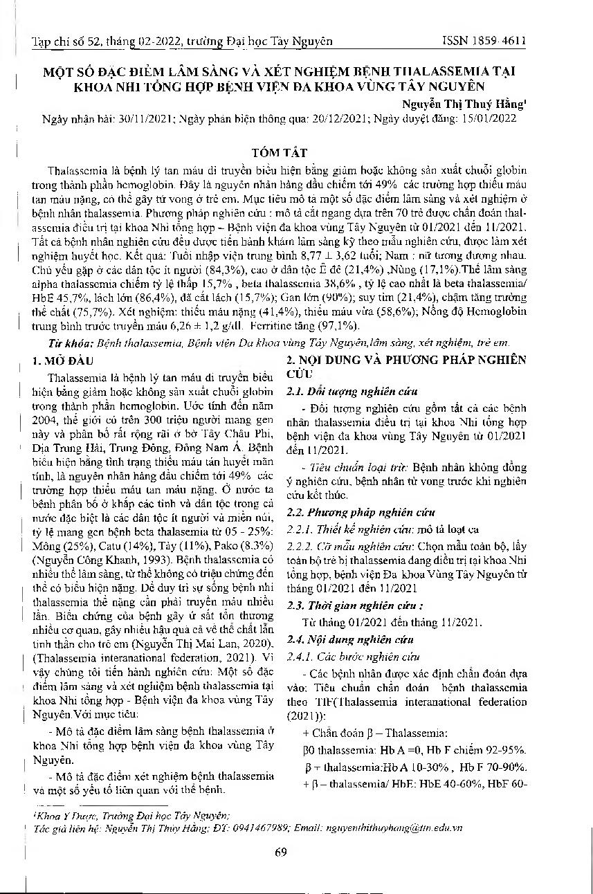Một số đặc điểm lâm sàng và xét nghiệm bệnh Thalassemia tại khoa Nhi Tổng hợp Bệnh viện Đa khoa vùng Tây Nguyên = Clinical and subclinical characteristics of Thalassemia at the Pediatrics Department of Tay Nguyen Regional General Hospital