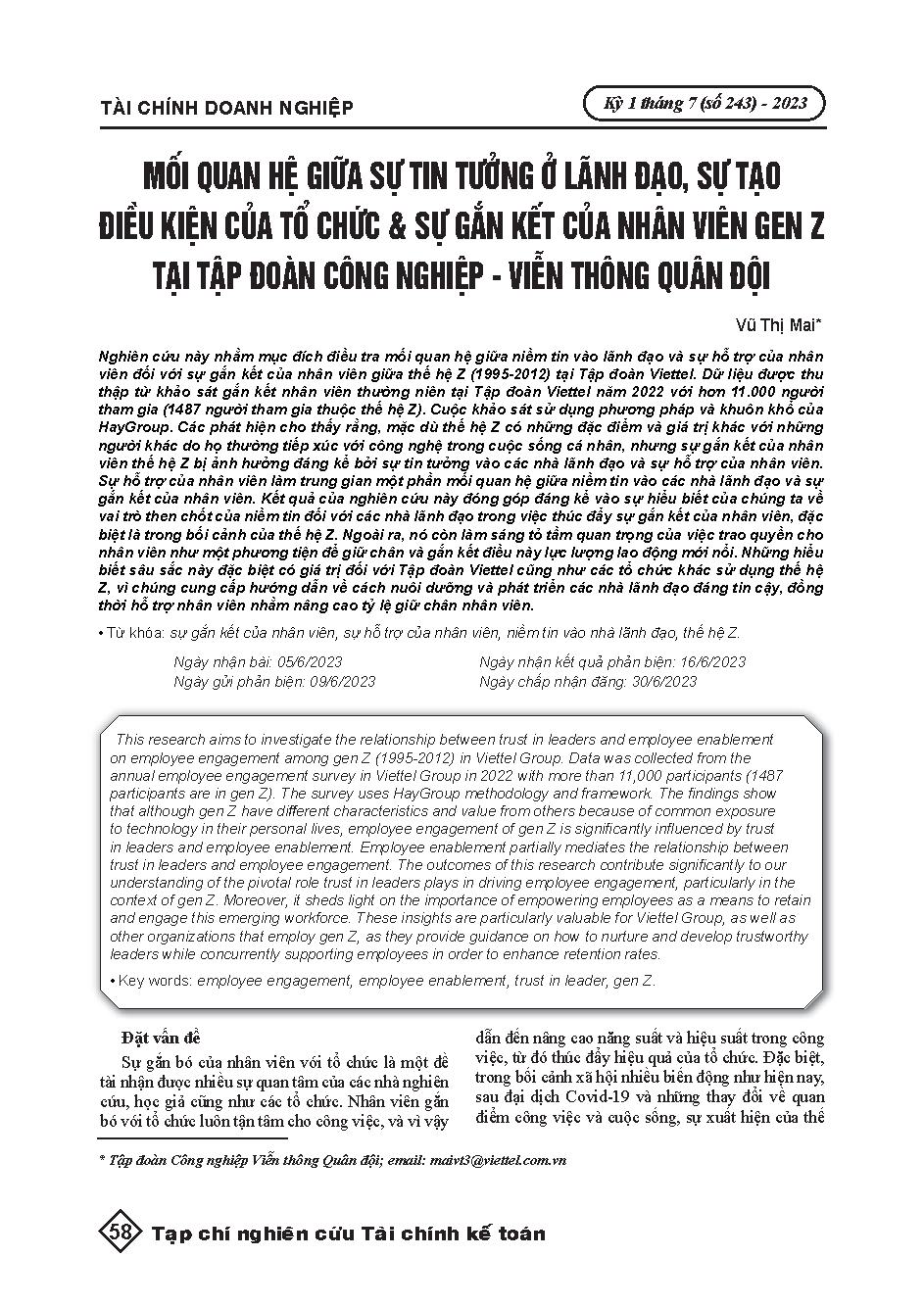 Mối quan hệ giữa sự tin tưởng ở lãnh đạo, sự tạo điều kiện của tổ chức & sự gắn kết của nhân viên gen Z tại Tập đoàn Công nghiệp - Viễn thông Quân đội = The relationship between leadership trust, organizational enablement and employee engagement of gen Z