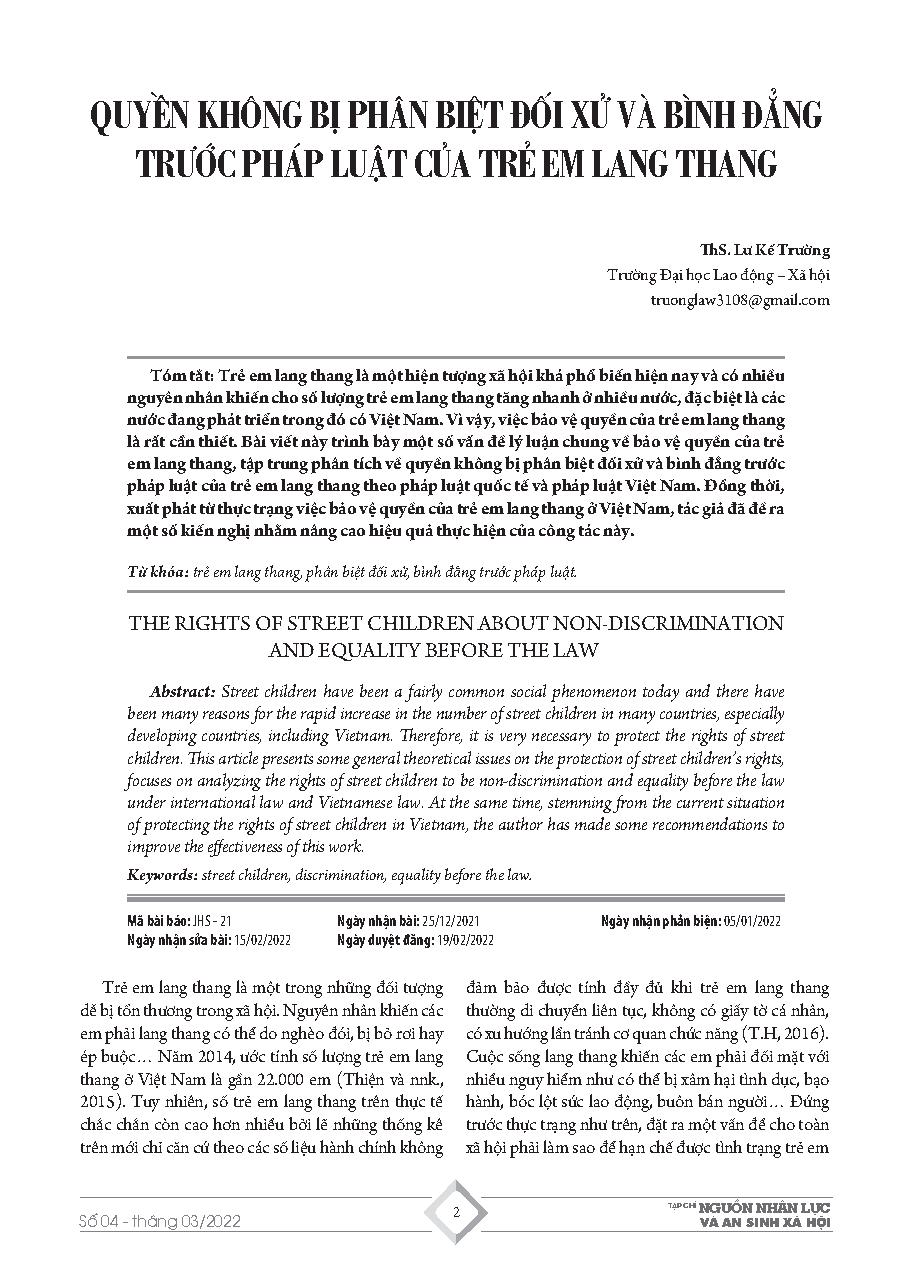 Quyền không bị phân biệt đối xử và bình đẳng trước pháp luật của trẻ em lang thang = The rights of street children about non-discrimination and equality before the law