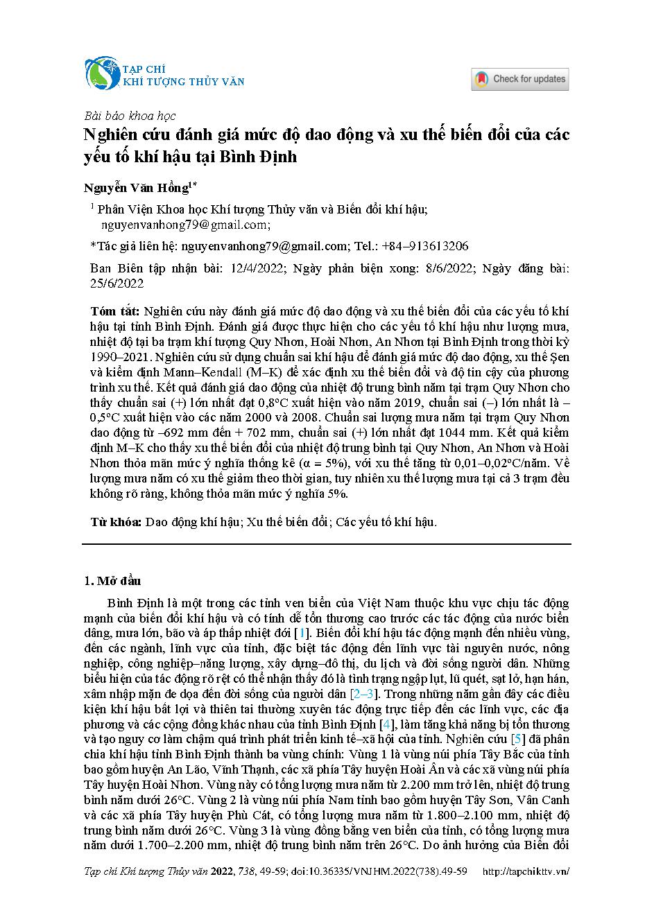 Nghiên cứu đánh giá mức độ dao động và xu thế biến đổi của các yếu tố khí hậu tại Bình Định = Assessment of variability and trends of climate factors in Binh Dinh province