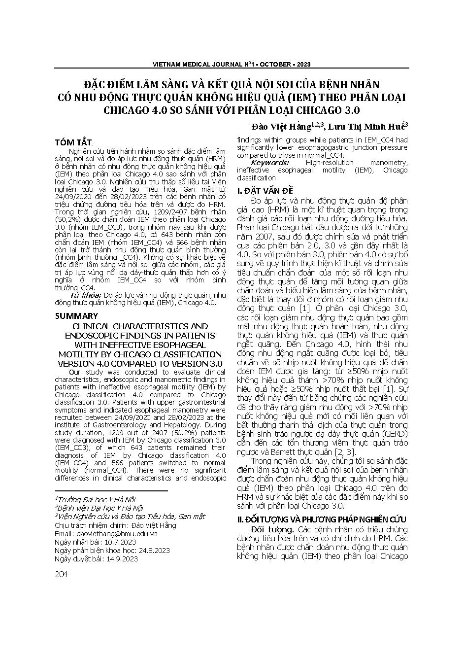 Đặc điểm lâm sàng và kết quả nội soi của bệnh nhân có nhu động thực quản không hiệu quả (IEM) theo phân loại Chicago 4.0 so sánh với phân loại Chicago 3.0 = Clinical characteristics and endoscopic findings in patients with ineffective esophageal motility