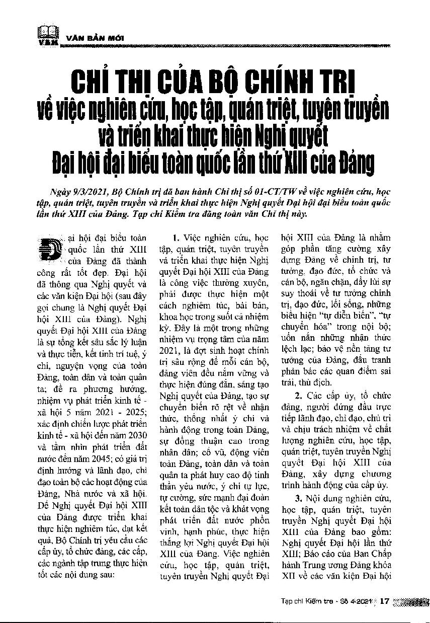 Chỉ thị của Bộ Chính trị về việc nghiên cứu, học tập, quán triệt, tuyên truyền và triển khai thực hiện Nghị quyết Đại hội đại biểu toàn quốc lần thứ XIII của Đảng
