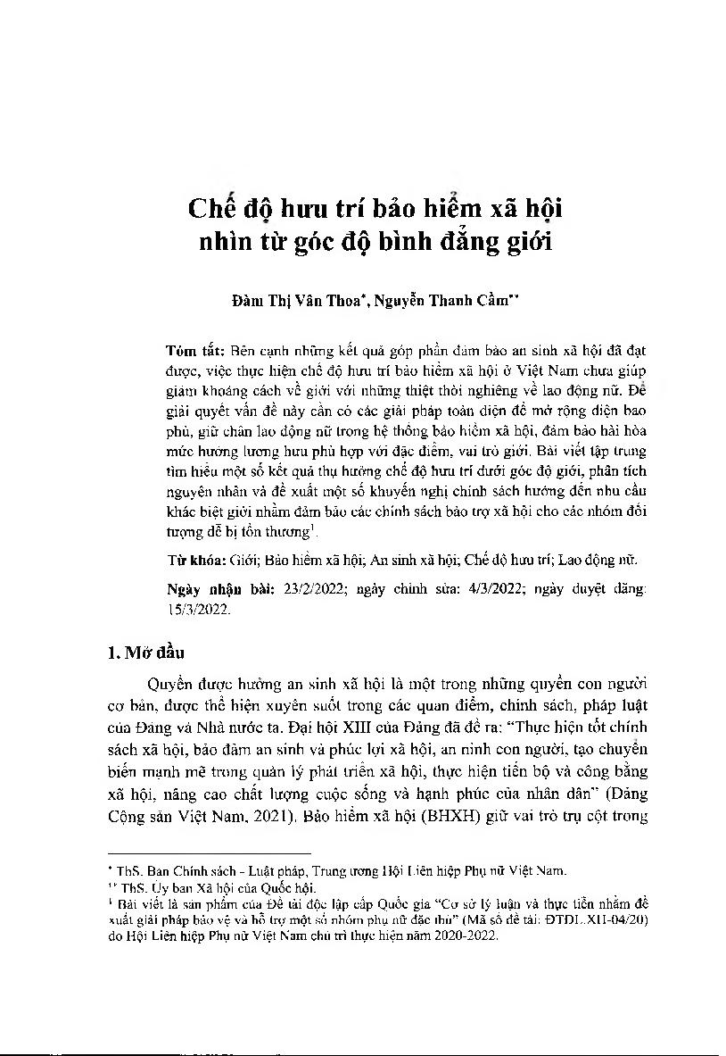 Chế độ hưu trí bảo hiểm xã hội nhìn từ góc độ bình đẳng giới = System ofsocial insurance retirement from a gender equality lense