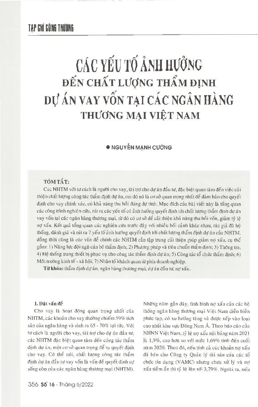 Các yếu tố ảnh hưởng đến chất lượng thẩm định dự án vay vốn tại các ngân hàng thương mại Việt Nam = Factors affecting the quality of project appraisal of commercial banks in Vietnam