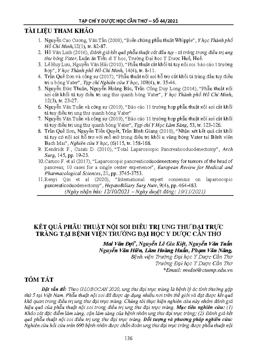 Kết quả phẫu thuật nội soi điều trị ung thư đại trực tràng tại bệnh viện trường đại học y dược Cần Thơ = The outcome of laparoscopic surgery for colorectal cancer in can tho university of medicine and pharmacy hospital