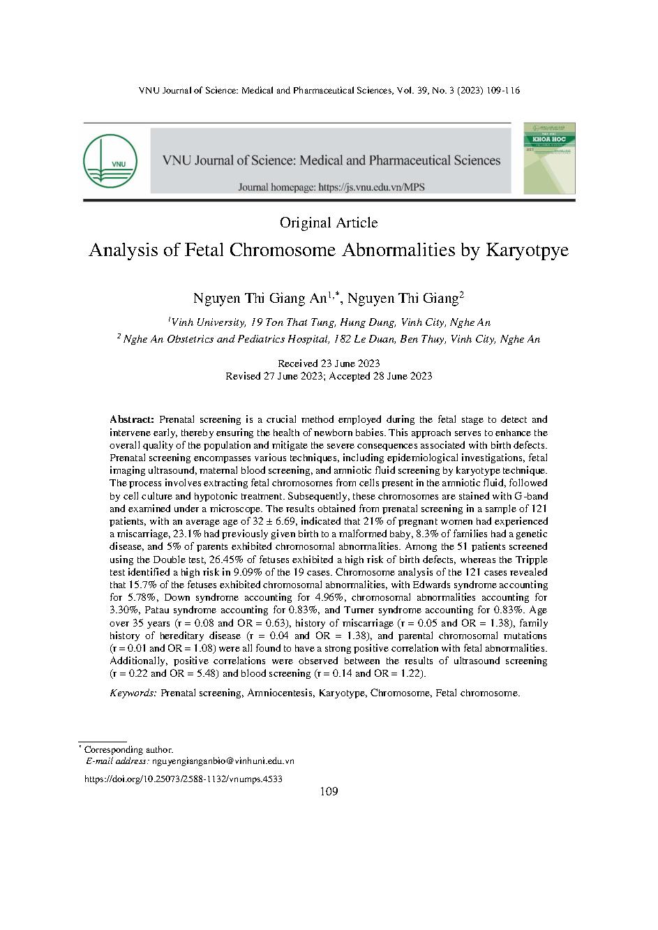 Phân tích các bất thường về nhiễm sắc thể thai nhi của Karyotpye = Analysis of Fetal Chromosome Abnormalities by Karyotpye