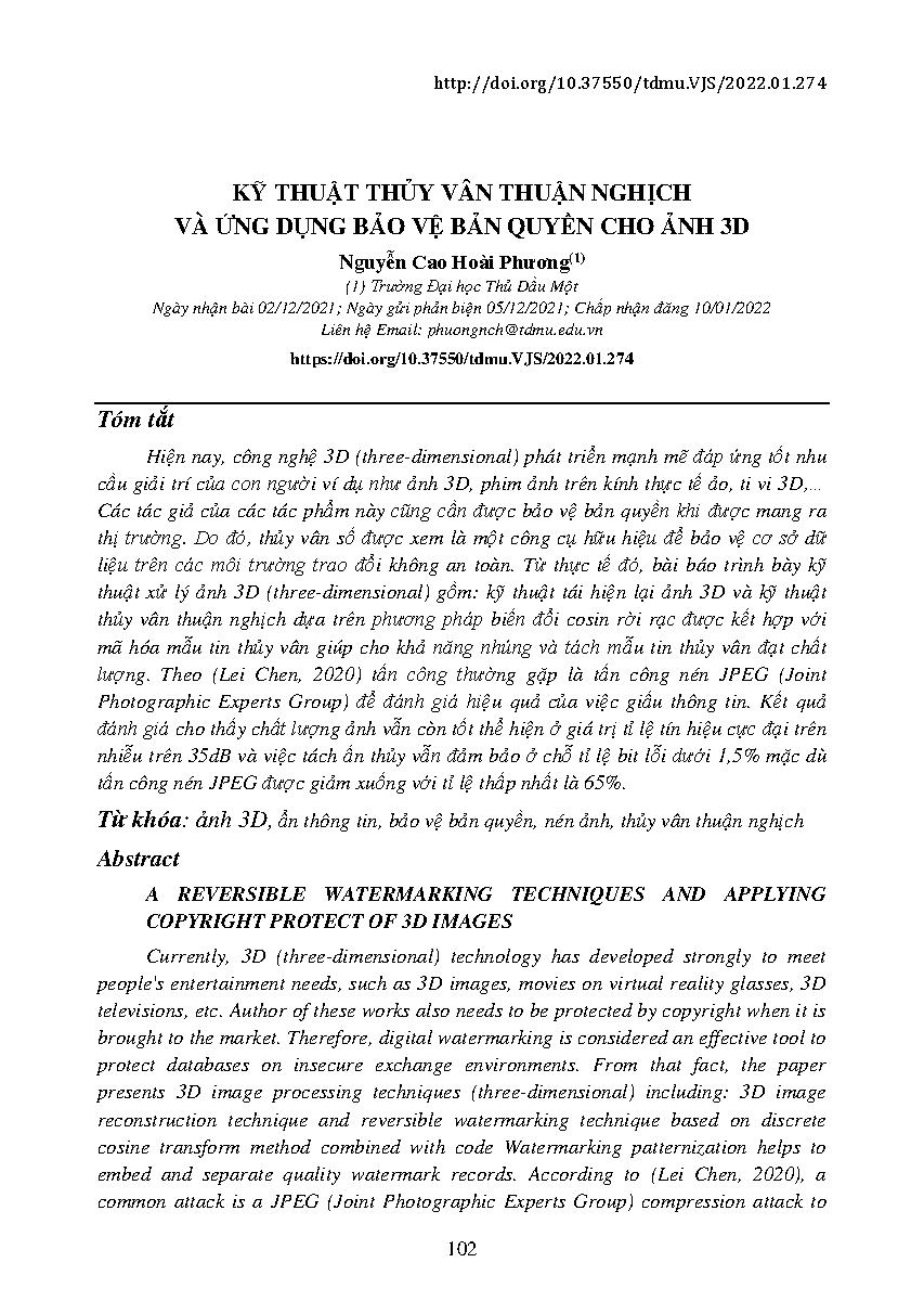 Kỹ thuật thủy vân thuận nghịch và ứng dụng bảo vệ bản quyền cho ảnh 3D = A reversible watermarking techniques and applying copyright protect of 3d images