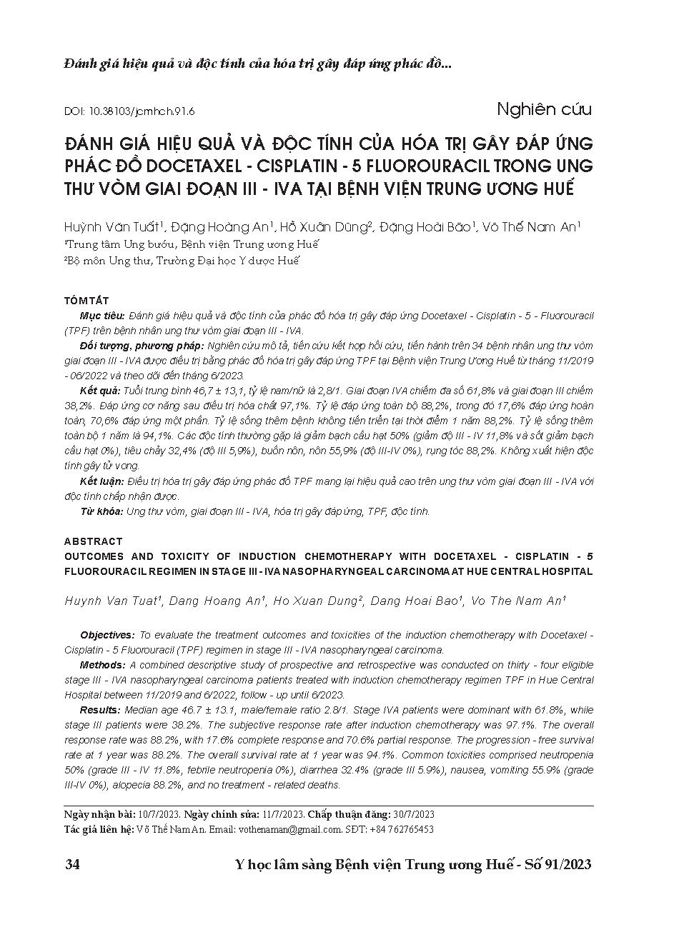 Đánh giá hiệu quả và độc tính của hóa trị gây đáp ứng phác đồ docetaxel - cisplatin - 5 fluorouracil trong ung thư vòm giai đoạn III - IVA tại Bệnh viện Trung ương Huế = Outcomes and toxicity of induction chemotherapy with docetaxel-cisplatin-5 fluorourac