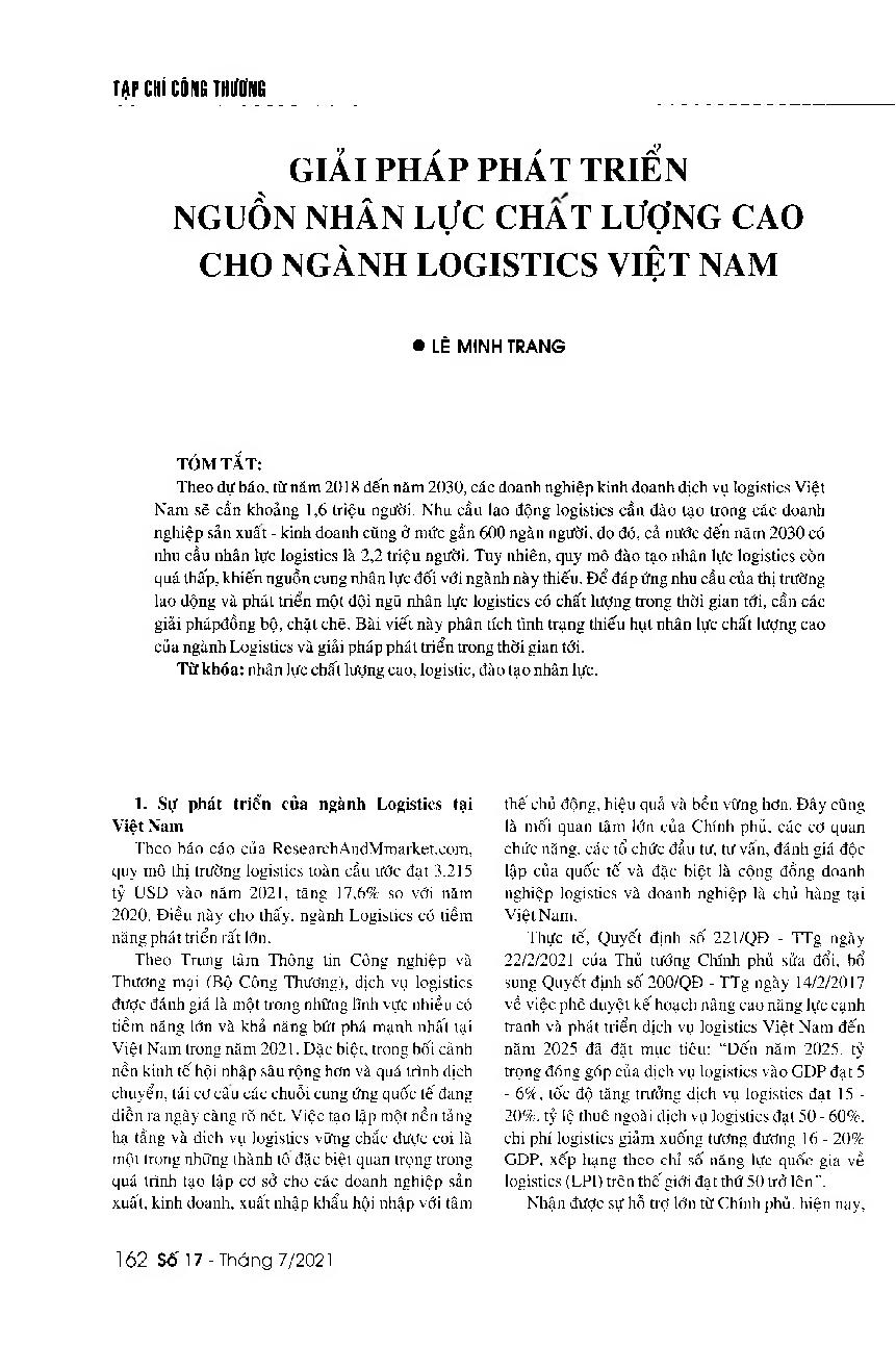 Giải pháp phát triển nguồn nhân lực chất lượng cao cho ngành Logistics Việt Nam = Solutions to develop high-quality human resources for Vietnam's logistics industry