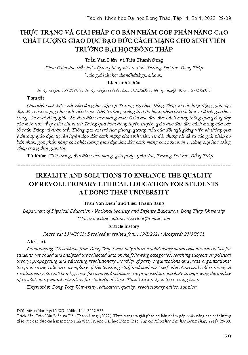 Thực trạng và giải pháp cơ bản nhằm góp phần nâng cao chất lượng giáo dục đạo đức cách mạng cho sinh viên Trường Đại học Đồng Tháp = Reality and solutions to enhance the quality of revolutionary ethical education for students at Dong Thap university