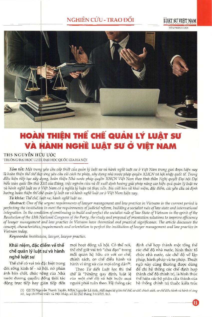 Hoàn thiện thể chế quản lý luật sư và hành nghề luật sư ở Việt Nam = Perfecting the institution of lawyer management and law practice in Vietnam