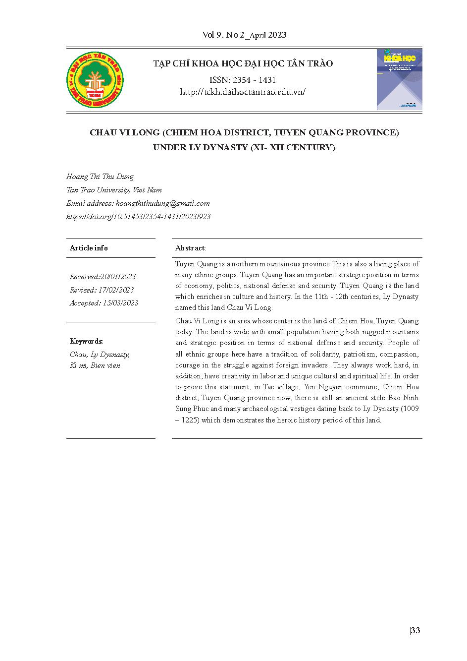 Châu Vị Long (Chiêm Hóa, Tuyên Quang) dưới thời nhà Lý (thế kỷ XI – XII) = Chau Vi Long (Chiem Hoa district, Tuyen Quang province) under Ly dynasty (XI- XII century)