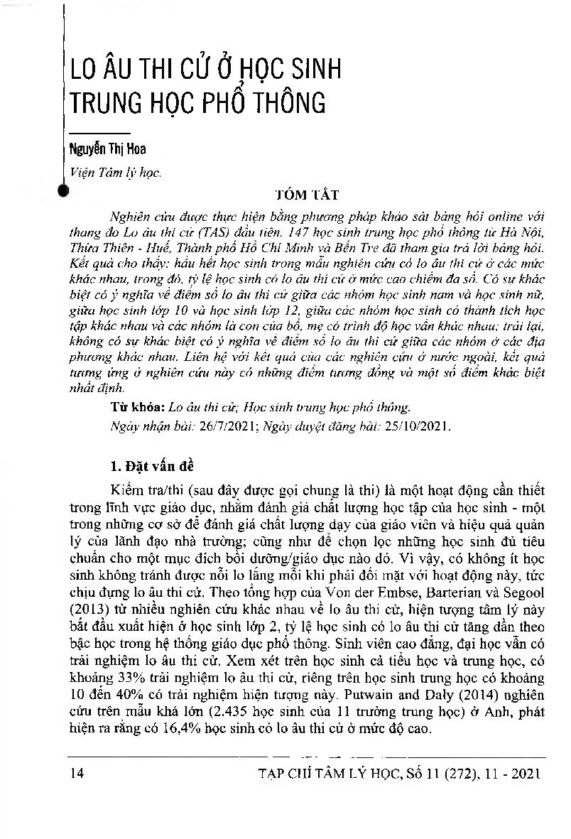 Lo âu thi cử ở học sinh trung học phổ thông = Test anxiety in upper secondary school students