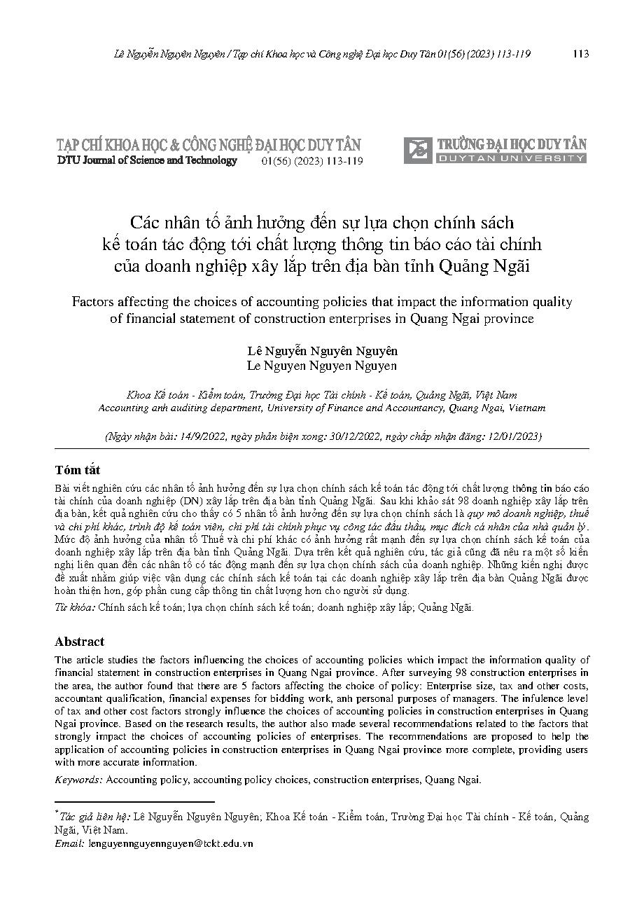 Các nhân tố ảnh hưởng đến sự lựa chọn chính sách kế toán tác động tới chất lượng thông tin báo cáo tài chính của doanh nghiệp xây lắp trên địa bàn tỉnh Quảng Ngãi