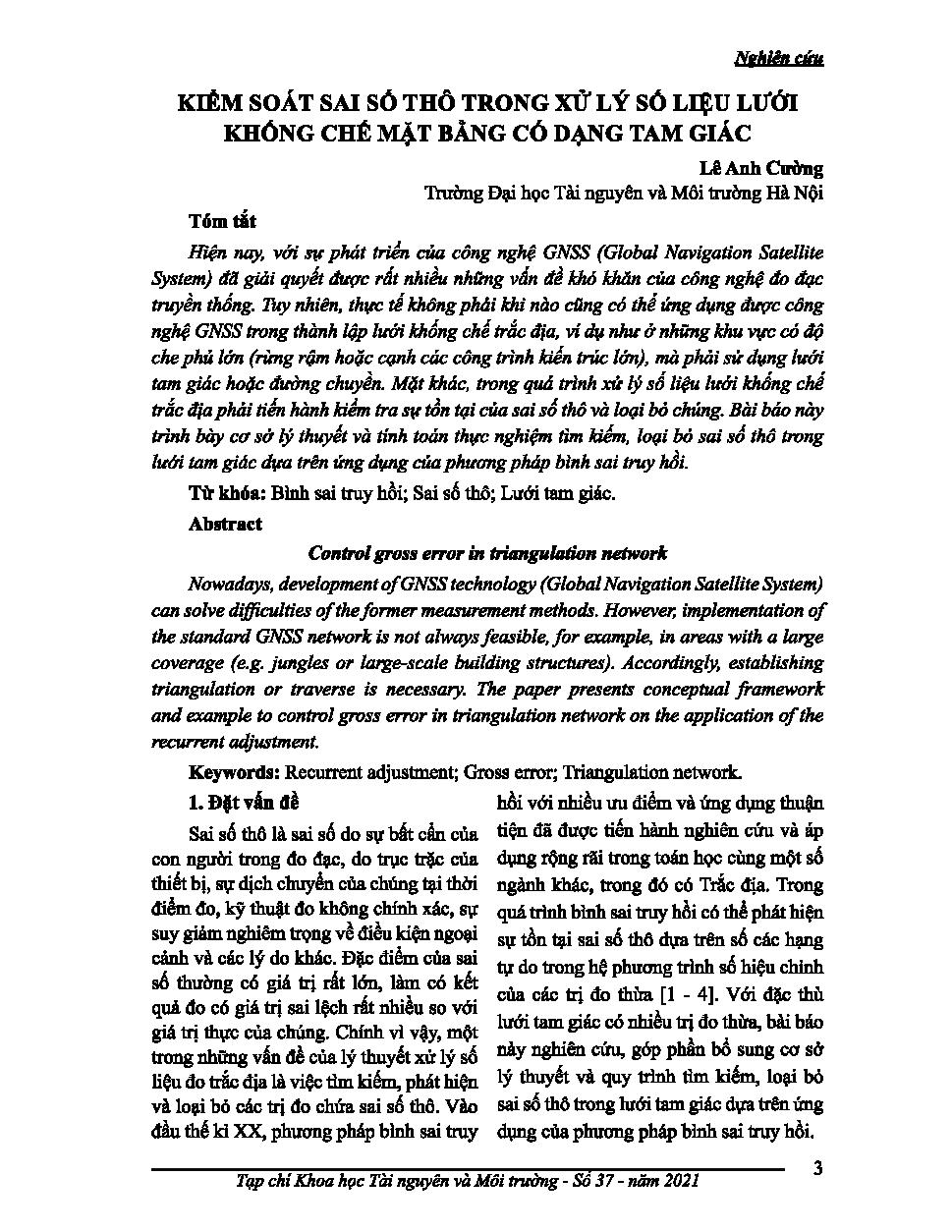 Kiểm soát sai số trong xử lý số liệu lưới khống chế mặt bằng có dạng tam giác = Control gross error in triangulation network