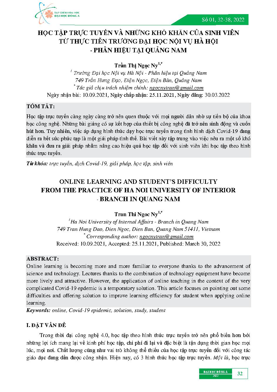 Học tập trực tuyến và những khó khăn của sinh viên từ thực tiễn trường đại học nội vụ hà hội - phân hiệu tại Quảng Nam = Online learning and student’s difficulty from the practice of ha noi university of interior - branch in Quang Nam