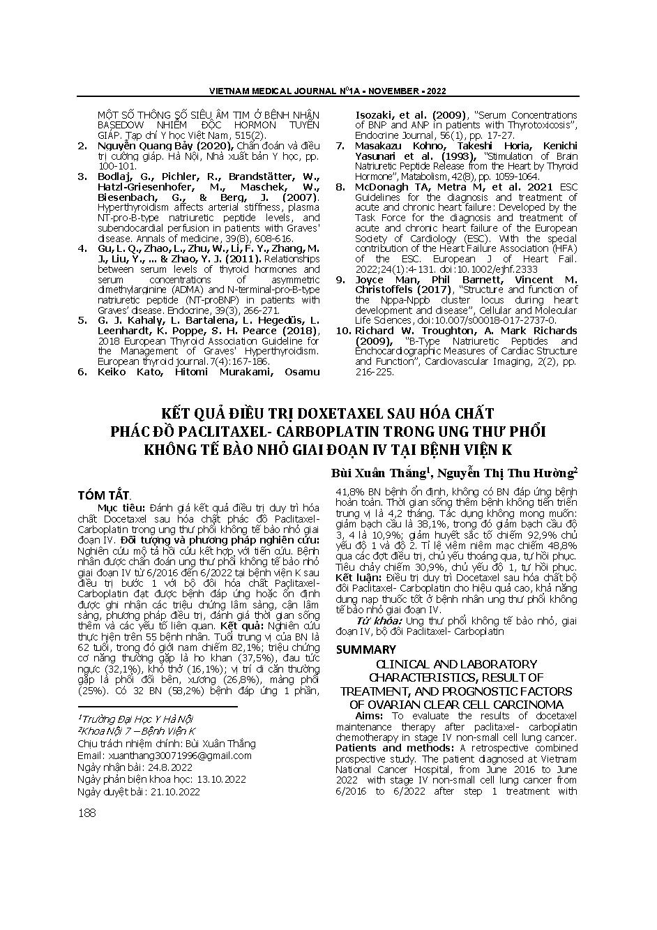 Kết quả điều trị docetaxel sau hóa chất phác đồ paclitaxel-carboplatin trong ung thư phổi không tế bào nhỏ giai đoạn IV tại Bệnh viện K = Clinical and laboratory characteristics, result of treatment, and prognostic factors of ovarian clear cell carcinoma