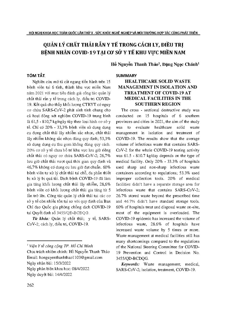 Quản lý chất thải rắn y tế trong cách ly, điều trị bệnh nhân Covid-19 tại cơ sở y tế khu vực miền Nam = Healthcare solid waste management in isolation and treatment of Covid-19 at medical facilities in the southern region