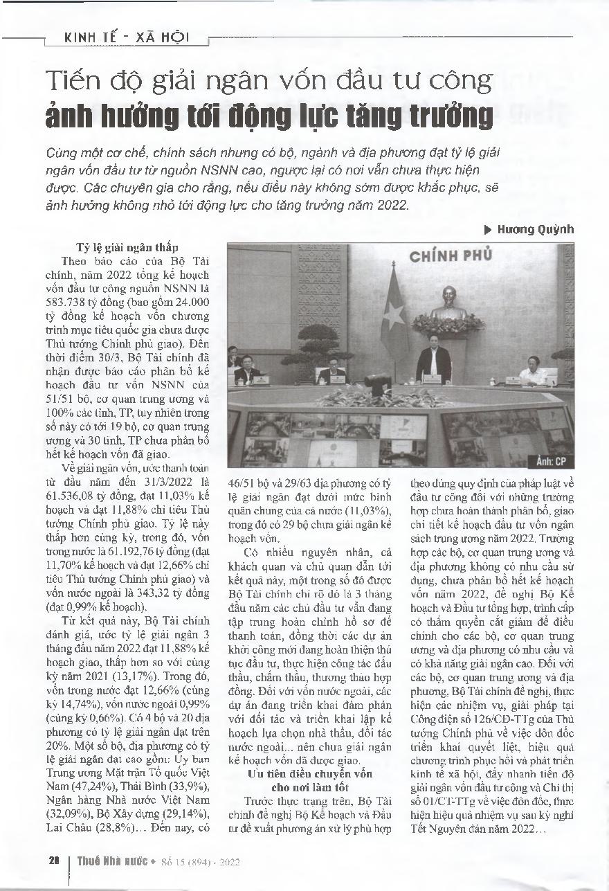 Tiến độ giải ngân vốn đầu tư công ảnh hưởng tới động lực tăng trưởng = Disbursement of public investment affects growth momentum