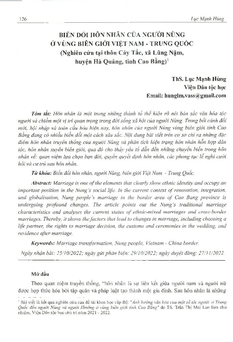 Biến đổi hôn nhân của người Nùng ở vùng biên giới Việt Nam - Trung Quốc (Nghiên cứu tại thôn Cáy Tắc, xã Lũng Nặm, huyện Hà Quảng, tỉnh Cao Bằng) = Changes in the Nung’s marriage in the Vietnam - China border area (Case study in Cay Tac village, Lung Nam