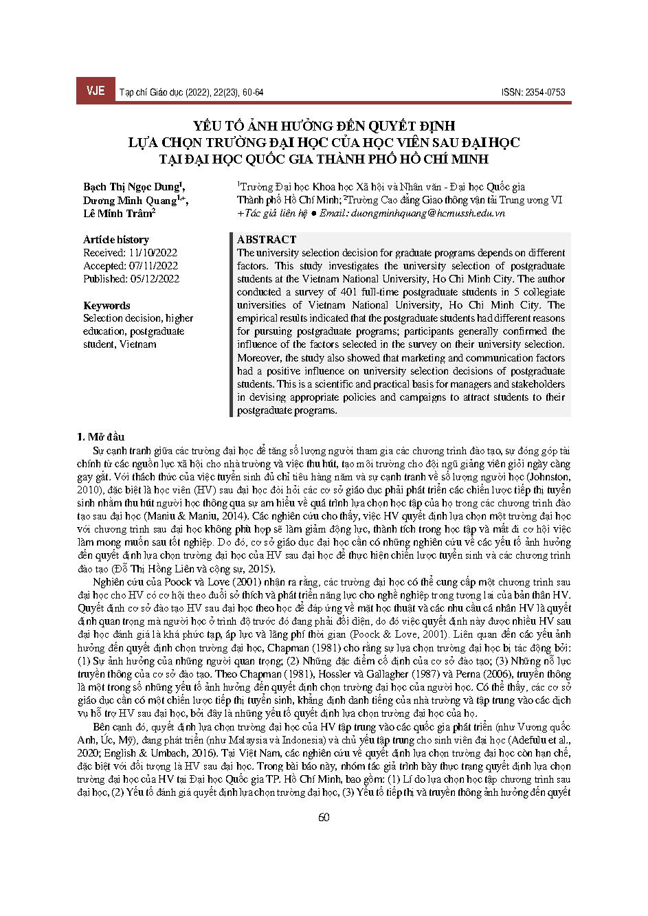 Yếu tố ảnh hưởng đến quyết định lựa chọn trường đại học của học viên sau đại học tại đại học quốc gia thành phố Hồ Chí Minh = Factors affecting the decision to choose a university of postgraduate students at Vietnam National University Ho Chi Minh City