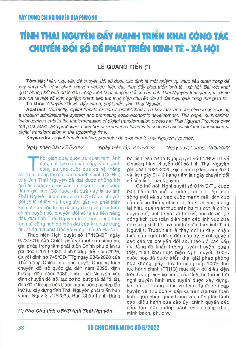 Tỉnh Thái Nguyên đẩy mạnh triển khai công tác chuyển đổi số để phát triển kinh tế - xã hội = Thai Nguyen Province promotes the implementation of digital transformation for socio-economic development