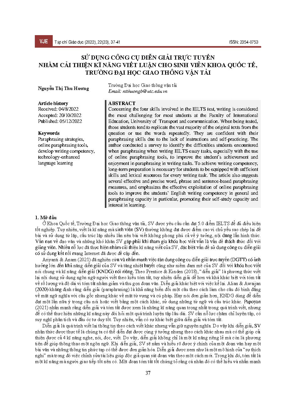 Sử dụng công cụ diễn giải trực tuyến nhằm cải thiện kĩ năng viết luận cho sinh viên khoa quốc tế, trường đại học giao thông vận tải = Using online interpretation tools to improve essay writing skills for international students, university of transport