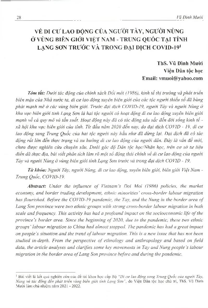 Về di cư lao động của người Tày, người Nùng ở vùng biên giới Việt Nam - Trung Quốc tại tỉnh Lạng Sơn trước và trong đại dịch COVID-19 = Labour Migration of Tay and Nung People in the Vietnam-China Border Area in Lang Son Province Before and During the COV