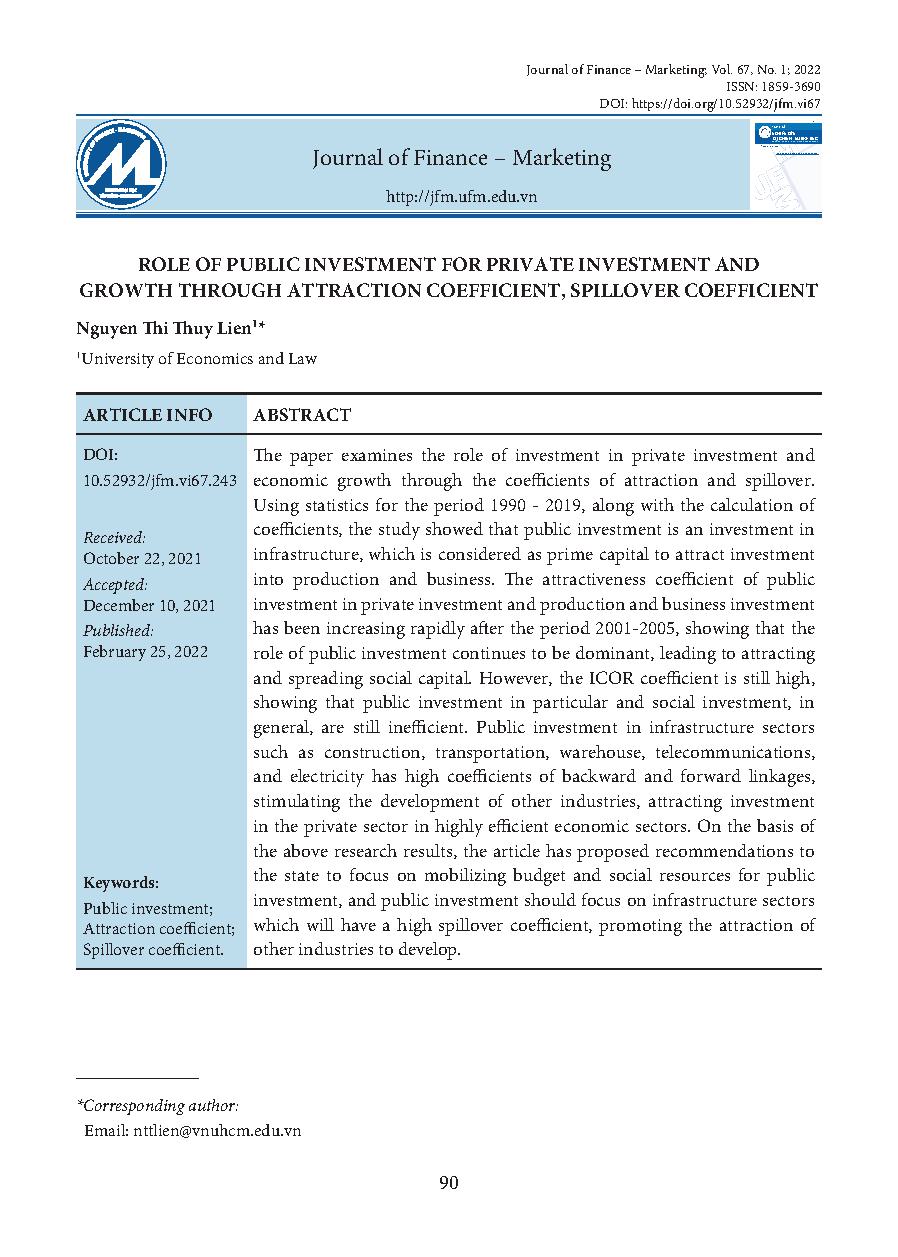 Vai trò của đầu tư công đối với đầu tư tư nhân và tăng trưởng qua các hệ số thu hút và lan tỏa = Role of public investment for private investment and growth through attraction coefficient, spillover coefficient