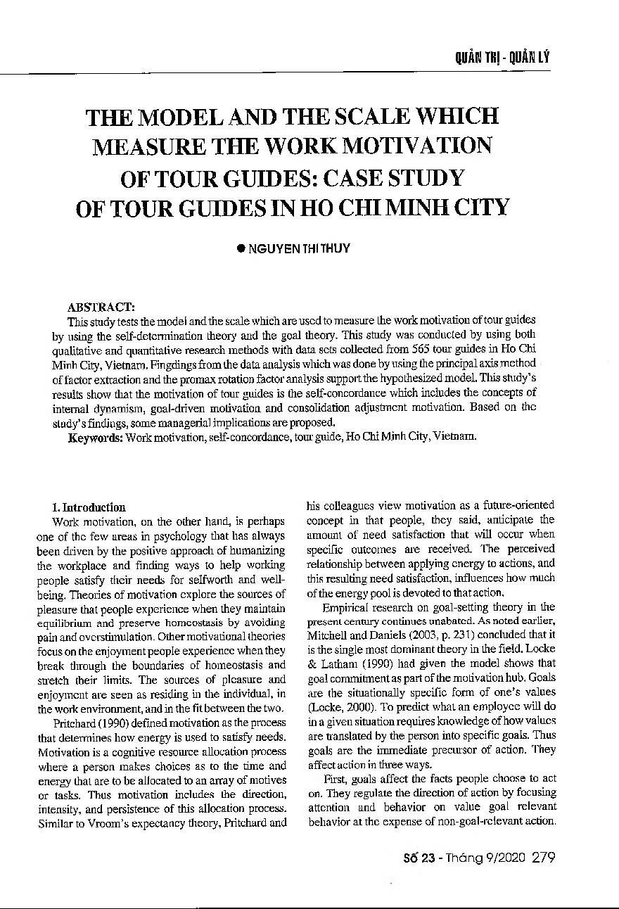Mô hình và thang đo động lực làm việc của hướng dẫn viên du lịch: Nghiên cứu trường hợp thành phố Hồ Chí Minh = Model and scale of work motivation of the tour guide: Case study Ho Chi Minh city