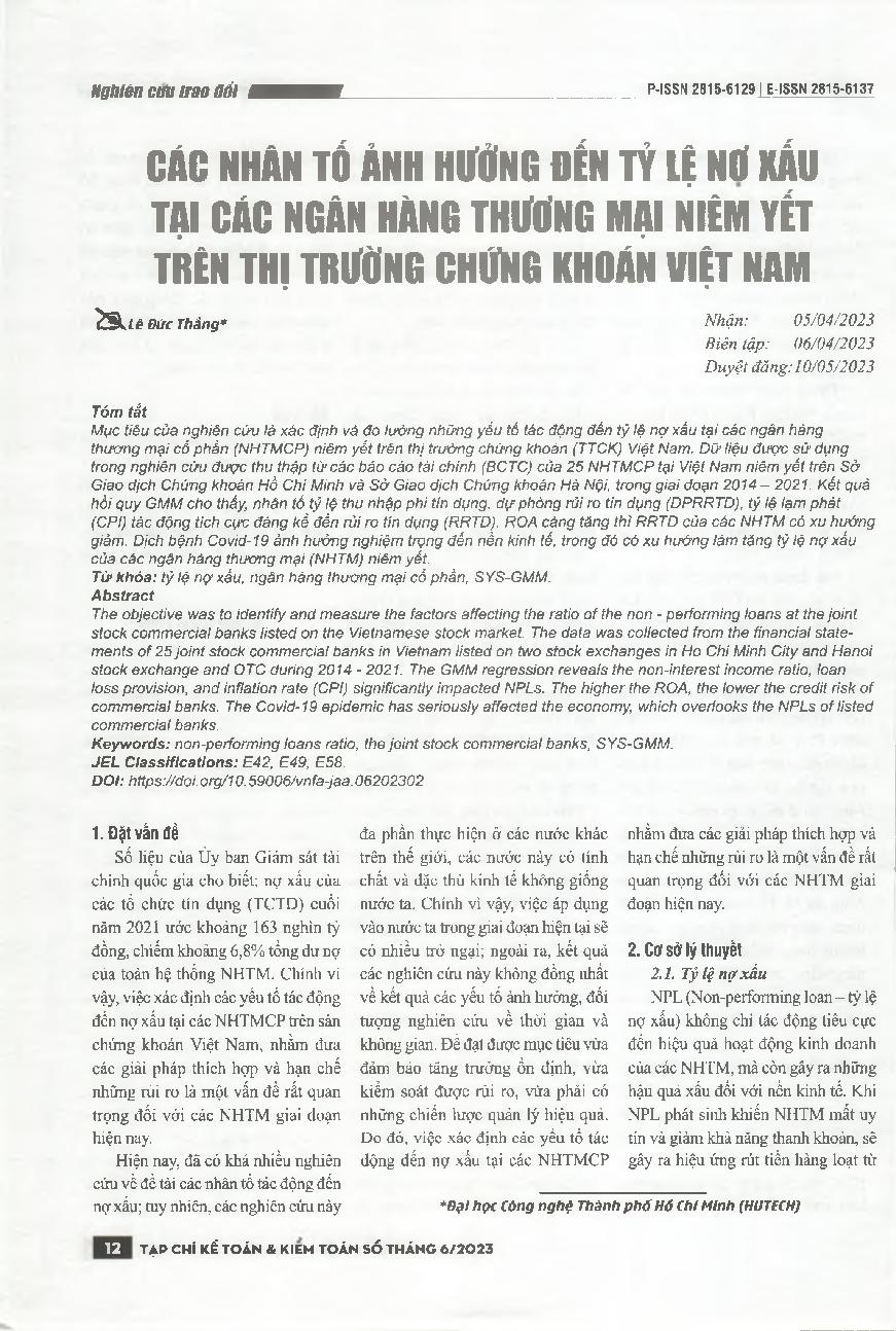 Các nhân tố ảnh hưởng đến tỷ lệ nợ xấu tại các ngân hàng thương mại niêm yết trên thị trường chứng khoán Việt Nam