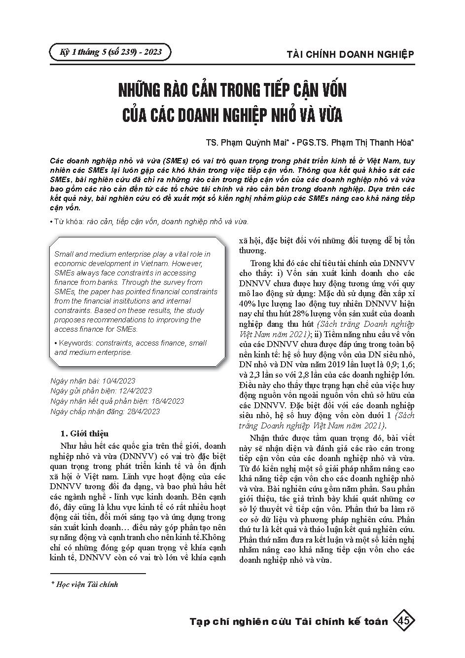 Những rào cản trong tiếp cận vốn của các doanh nghiệp nhỏ và vừa = Barriers to access capital of small and medium enterprises