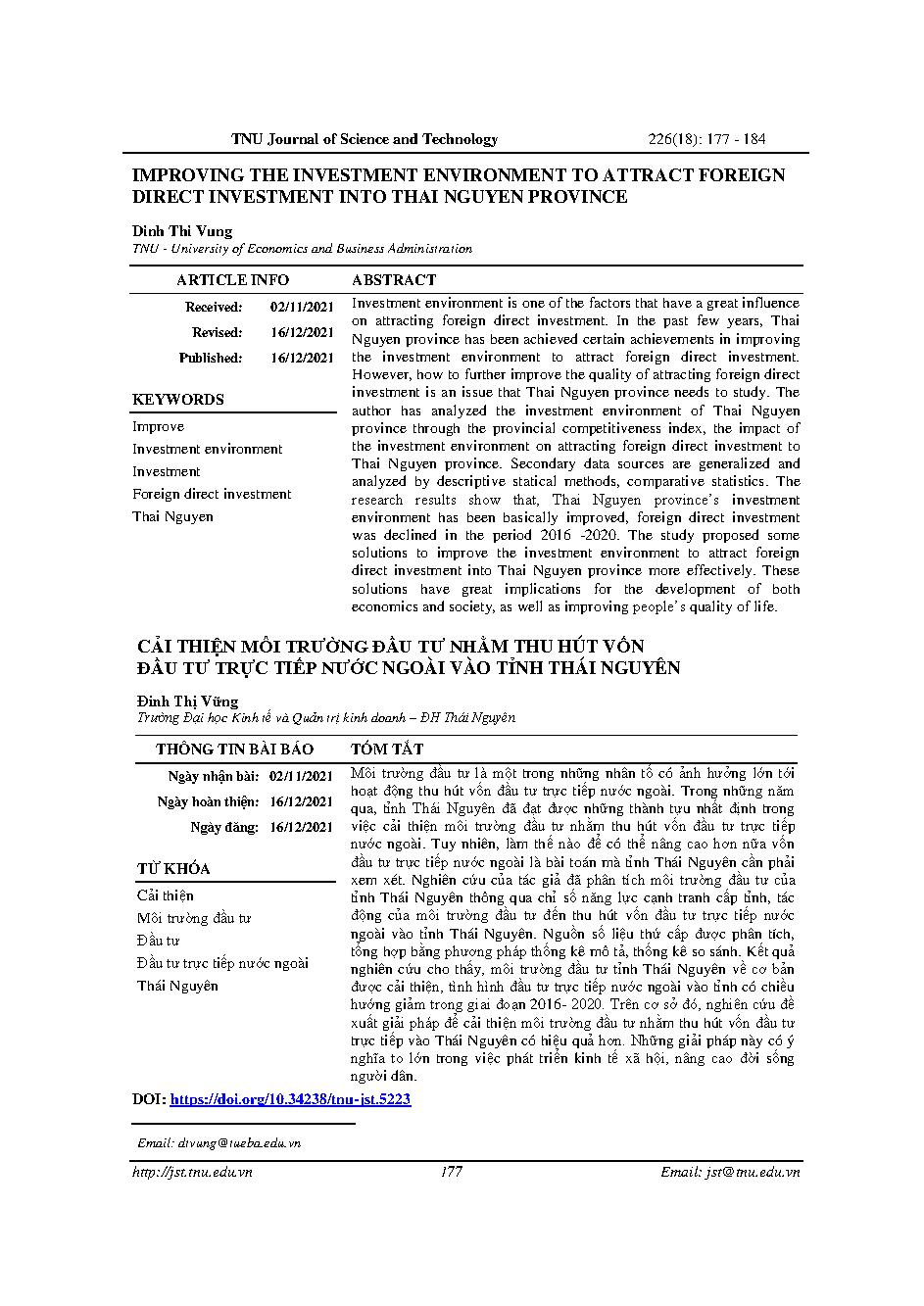 Cải thiện môi trường đầu tư nhằm thu hút vốn đầu tư trực tiếp nước ngoài vào tỉnh Thái Nguyên = Improving the investment environment to attract foreign direct investment into Thai Nguyen province