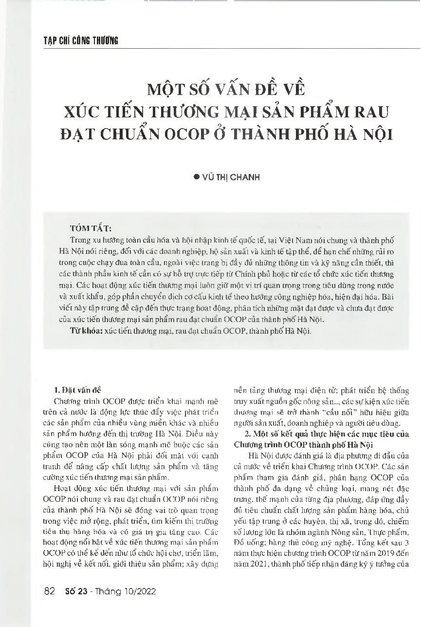 Một số vấn đề về xúc tiến thương mại sản phẩm rau đạt chuẩn OCOP ở thành phố Hà Nội = Some issues about the trade promotion for OCOP vegetable in Hanoi city