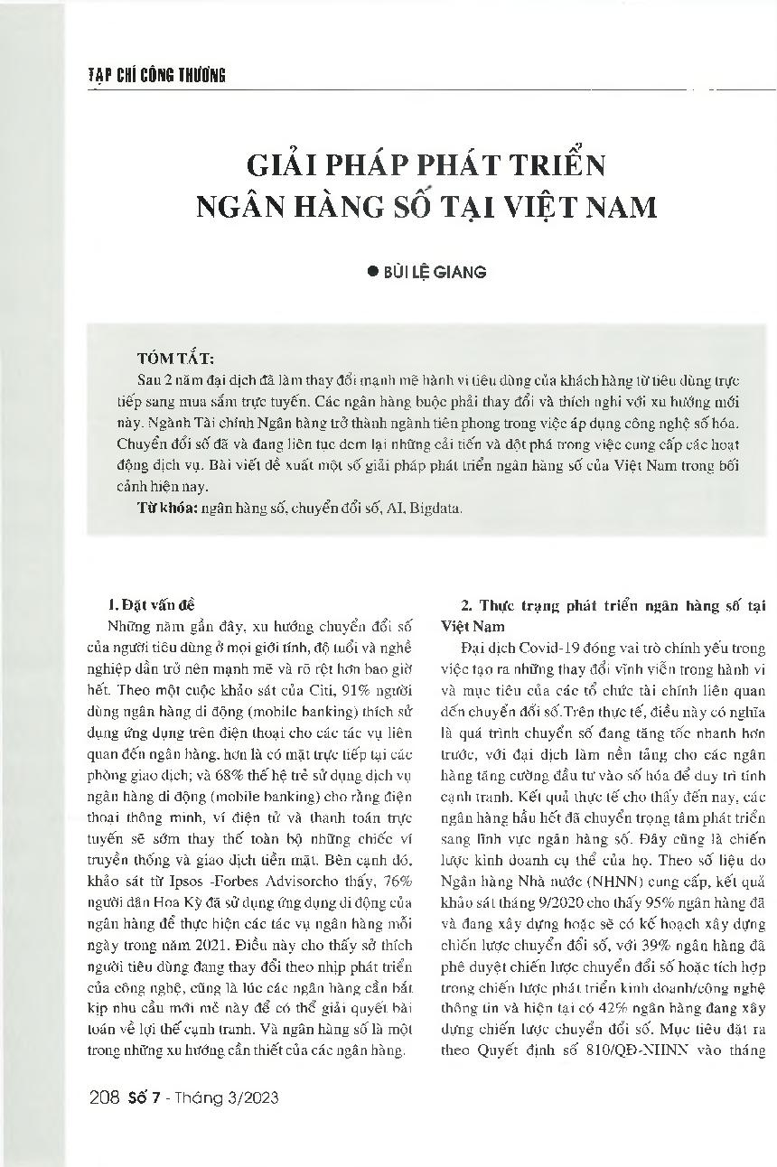 Giải pháp phát triển ngân hàng số tại Việt Nam = Solutions to facilitate the development of digital banking in Vietnam