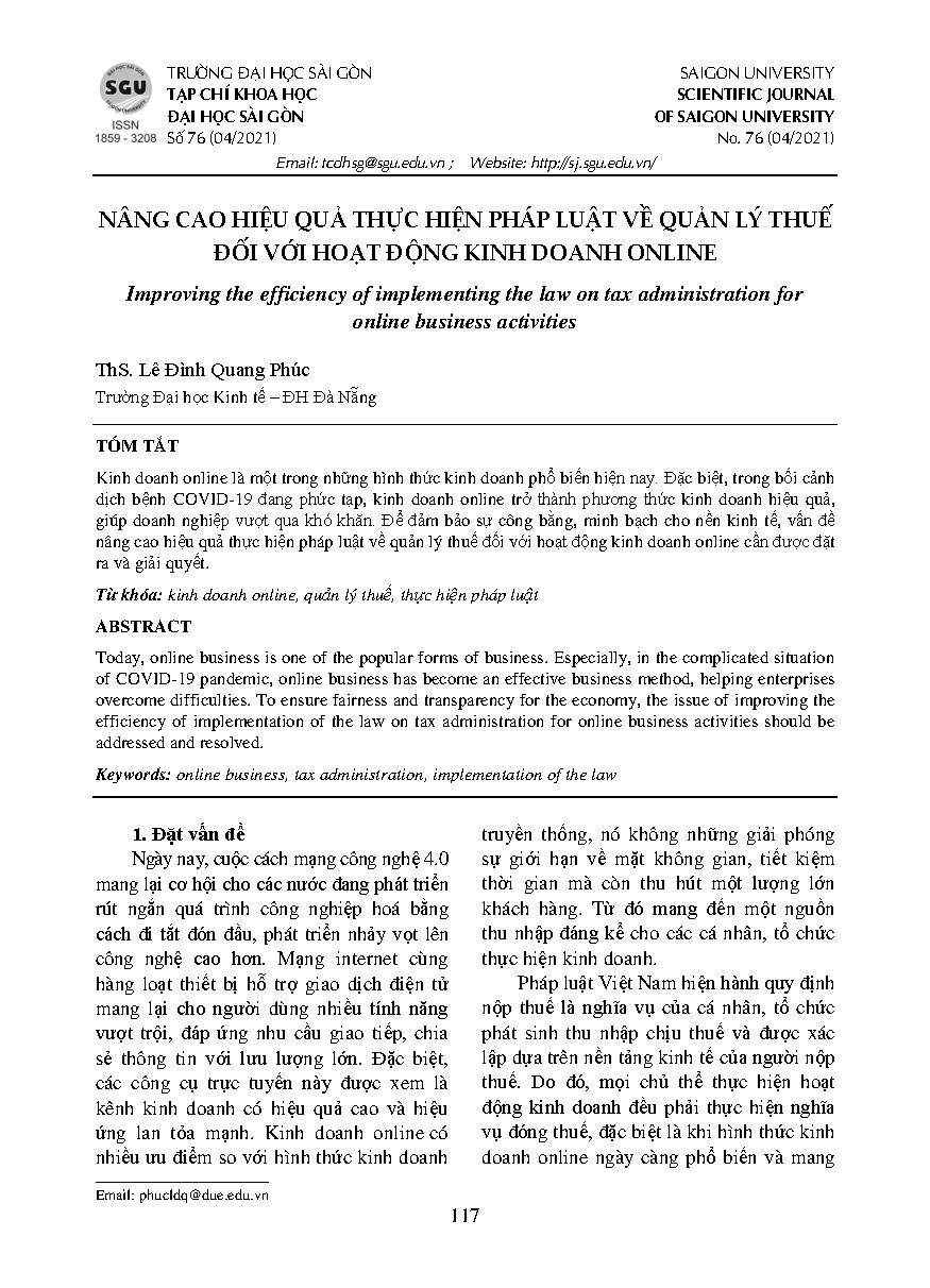 Nâng cao hiệu quả thực hiện pháp luật về quản lý thuế đối với hoạt động kinh doanh online = Improving the efficiency of implementing the law on tax administration for online business activities