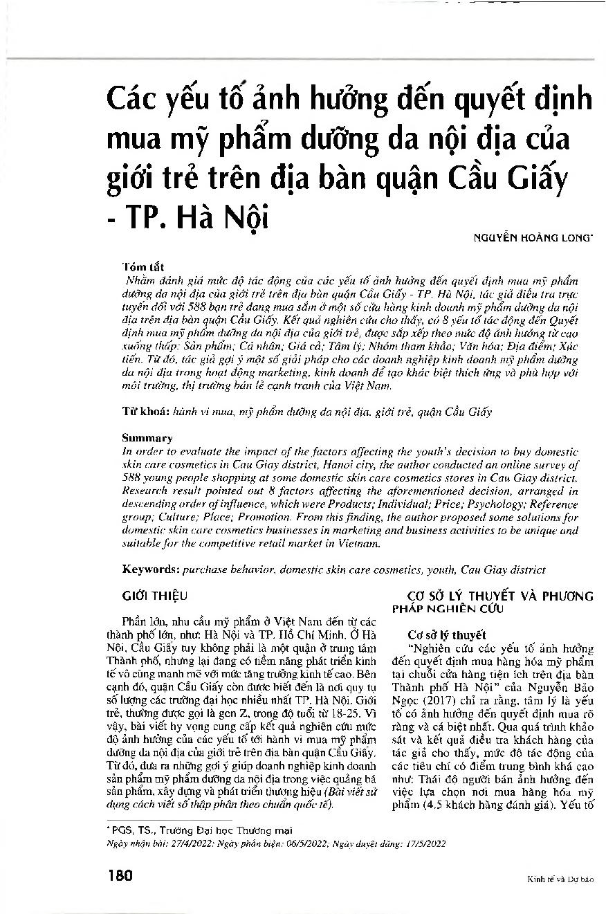Các yếu tố ảnh hưởng đến quyết định mua mỹ phẩm dưỡng da nội địa của giới trẻ trên địa bàn quận Cầu Giấy - TP. Hà Nội = Factors affecting young people’s decision to buy domestic skin care cosmetics in Cau Giay district, Hanoi city